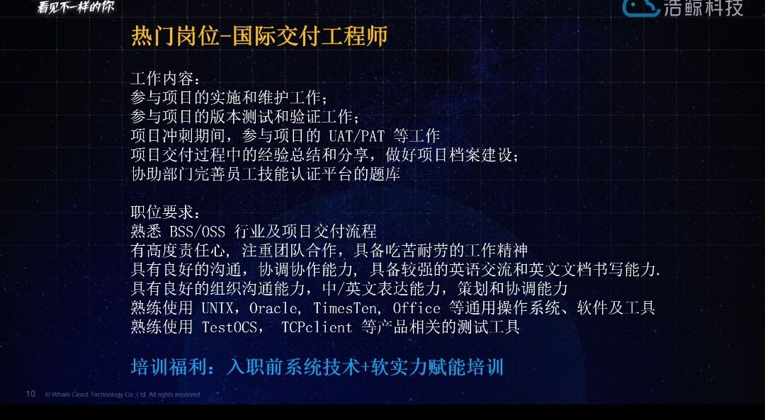 招聘会由浩鲸云计算科技股份有限公司招聘专员主讲,招聘会初始,一段介绍浩鲸科技的视频直击眼球,该公司聚焦通信服务、城市大脑、产业互联网三大业务领域,让同学们既迅速又详细地了解了公司的简介、历史与发展前景;接着,招聘专员对毕业生感兴趣的招聘岗位、待遇等情况进行了解读;最后说明了面试规则和流程,并约定了对通过简历筛选的同学进行面试的时间。